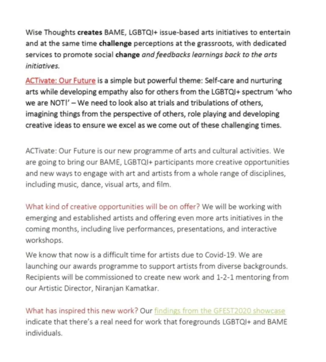 Our GFEST – Gaywise FESTival ® – stories of BAME, LGBTQI+ people across the UK Click here to watch videos and webinars. Click to read the report by director Niranjan Kamatkar and the Consortium .
